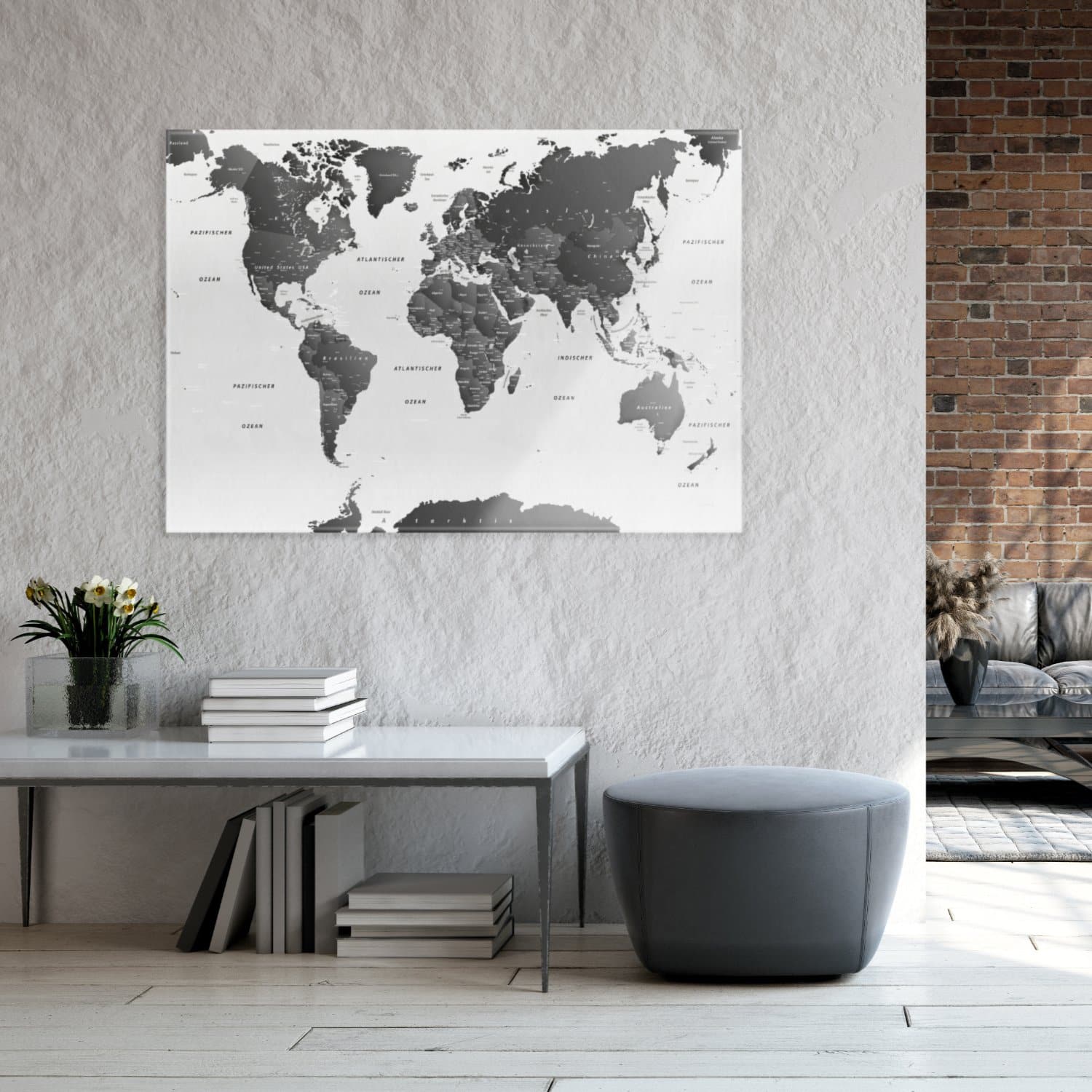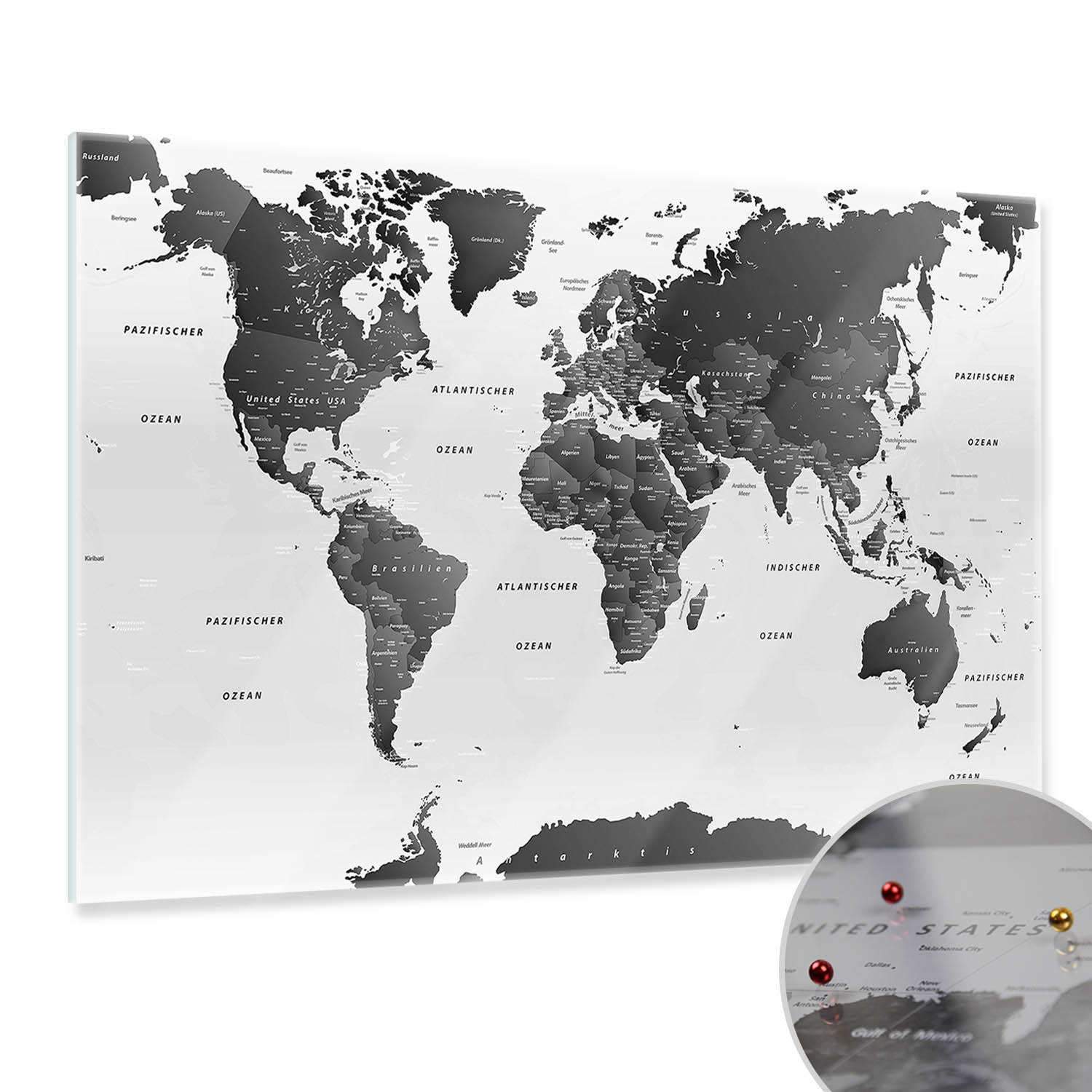 Magnetisches Glasbild - Weltkarte SW Hell